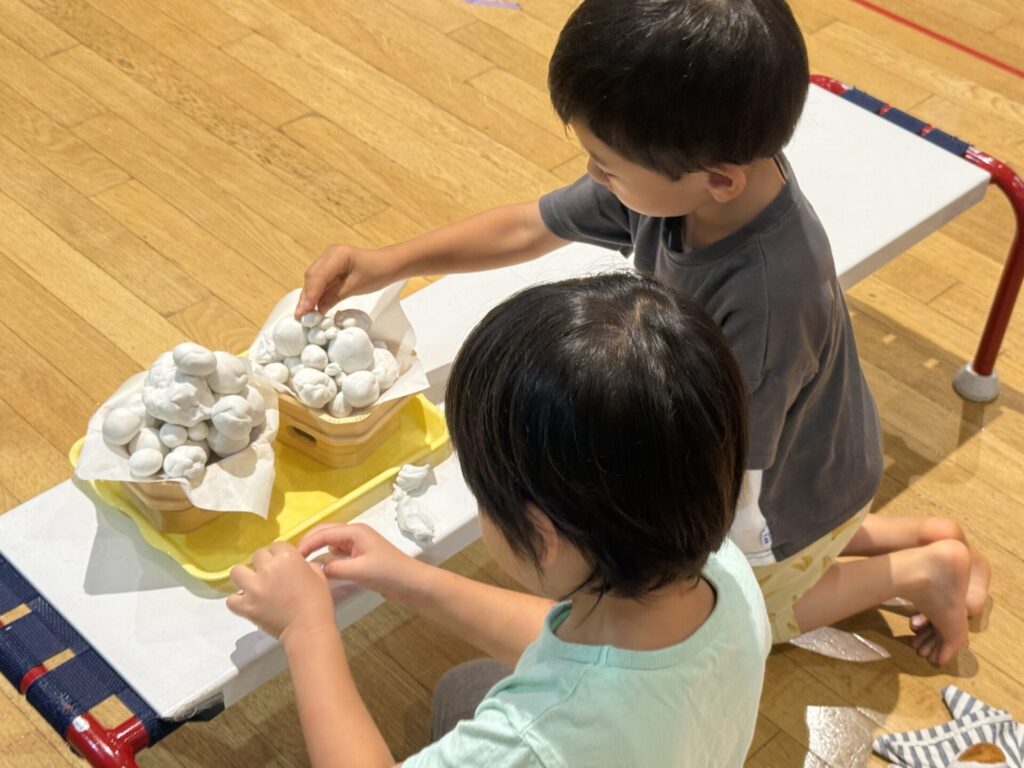 保育園では安全面を考慮してお団子の提供ができないため、粘土でお団子を作りましたよ。